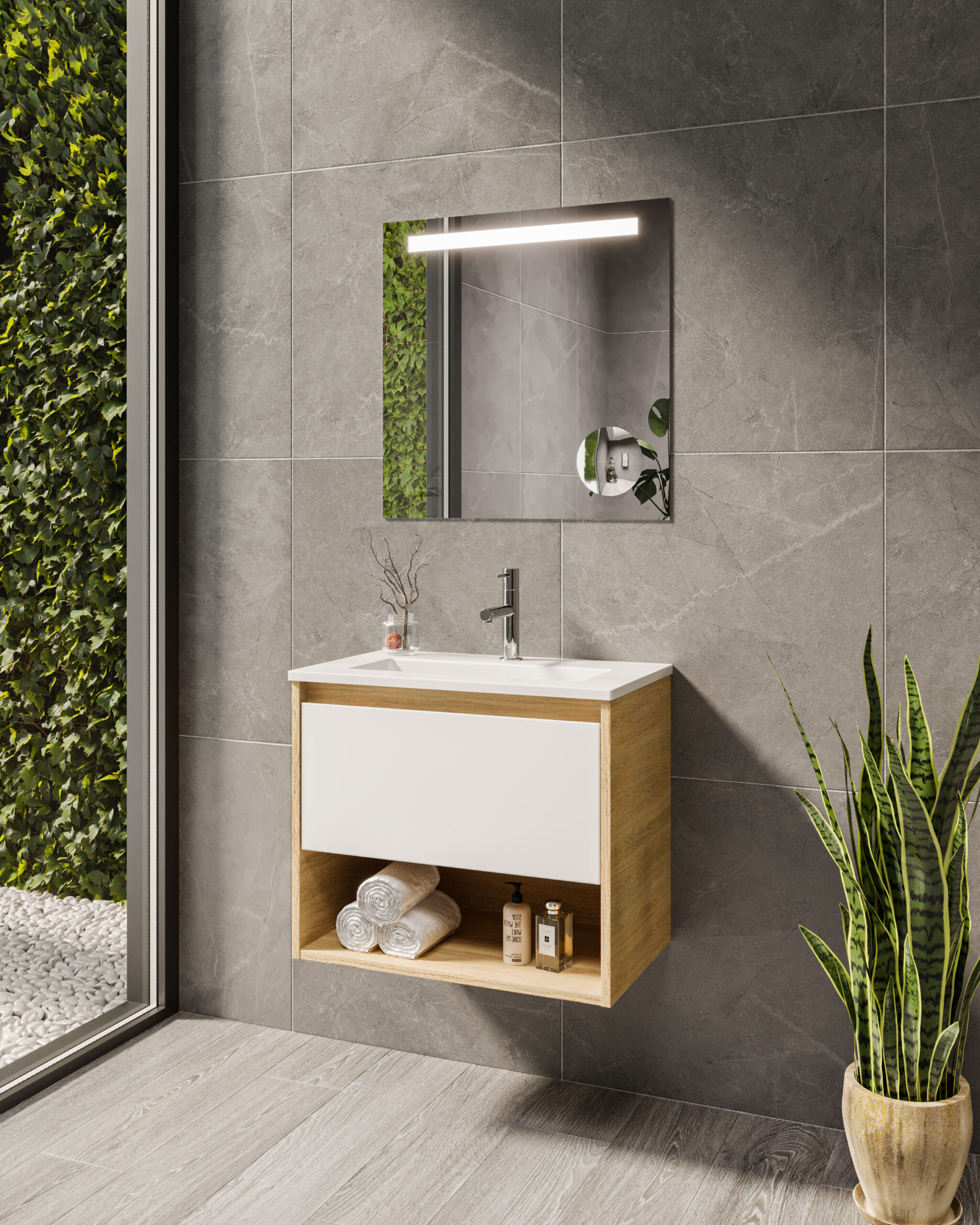 O móvel de casa de banho Anchor alia design compacto à máxima funcionalidade, ideal para espaços modernos e pequenos. Com estrutura suspensa e sistema soft close, garante um ambiente organizado e silencioso, ao mesmo tempo que facilita a limpeza do chão.