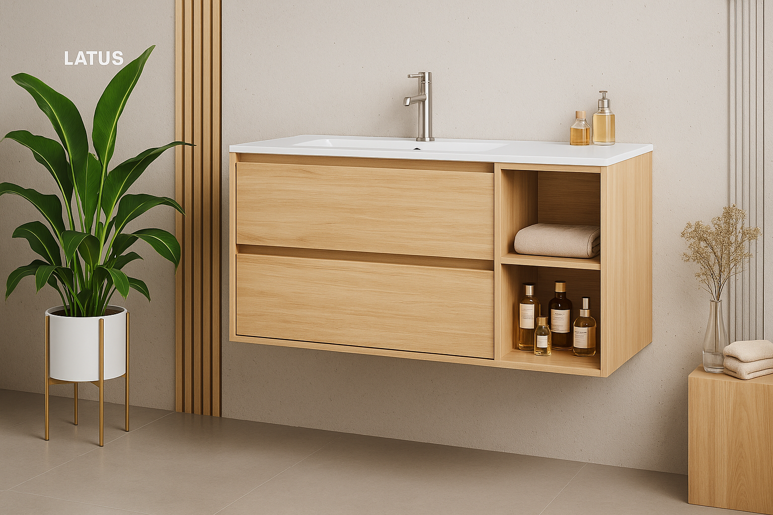 O móvel Latus é a escolha ideal para casas de banho modernas que valorizam design e funcionalidade. Com estrutura suspensa, oferece um visual leve e elegante, facilitando a limpeza e a organização do espaço.